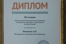 Поздравляем ученика 8а класса Исмагилова Амира с дипломом III степени IX Всероссийской научно-практической конференции "Татарский яхык, литература и история: прошлое, настоящее, будущее" (Руководитель: Р. Р. Хуснуллина). Желаем дальнейших успехов!