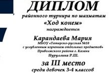 Поздравляем ученицу 4 кл, Карандаеву Марию, занявшую 3 место в IX районном турнире по шахматам "Ход конем". Желаем ей и ее наставнице - Нуруллиной Розе Шавкатовне дальнейших успехов!