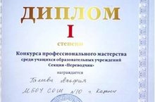 Ученица 11 класса Галеева Альфия прошла на городской этап конкурса профессионального мастерства среди учащихся общеобразовательных учреждений. Успешно выступив на секции “Переводчик”, она была награждена Дипломом I степени (педагог – Куркина А.И.). Поздравляем и желаем дальнейших успехов!