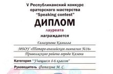 Поздравляем ученика 4 класса Галиханову Камиллу (учитель английского языка Фатахова М.С.) дипломом лауреата и учителя английского языка Илаеву Р.А. с дипломом Гран при на V Республиканском конкурсе ораторского мастерства «Speaking contest». Желаем дальнейших успехов