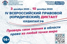 Общероссийская общественная организация «Ассоциация юристов России» с 3 по 10 декабря 2020 года в целях оценки уровня правовой грамотности населения проводит IV Всероссийский правовой (юридический) диктант. Диктант проводится в режиме онлайн на официальном портале юрдиктант.рф. Далее: