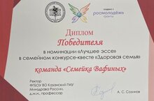 Поздравляем семью Вафиной Суфии, ученицы 5А класса (классный руководитель Мухаметгалиева А.Р.), победившей в номинации "Лучшее эссе" в семейном конкурсе-квесте по питанию "Здоровая семья".