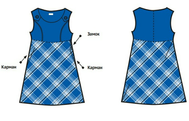 1-4 классы: сарафан с синей грудкой на перестежках на плечах и низом (юбка-полусолнце) в сине-голубую клетку с карманами