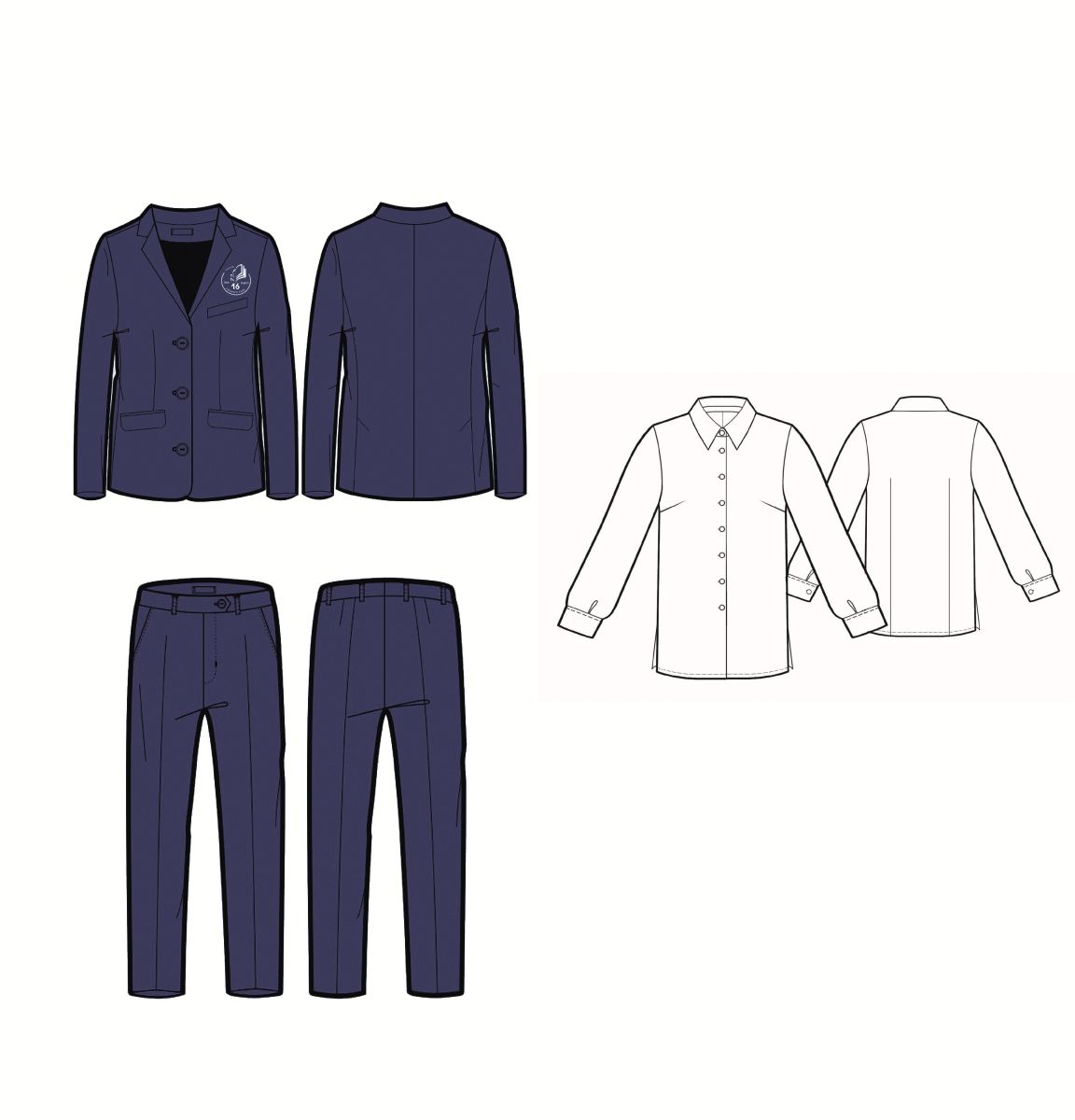 Однотонная блузка — белая или голубая (ниже талии, глухо застёгнутая, плосколежащий воротник)