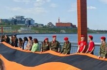 На набережной Казанки возле экстрим-парка УРАМ в столице Татарстана 24 апреля состоялась патриотическая акция «Георгиевская лента». Ее организатором выступило татарстанское отделение «Молодой Гвардии Единой России» при содействии городских и республиканских властей. В ходе акции развернули огромную георгиевскую ленту: ее длина составила целых 300 метров. Юнармейцы школы приняли участие в этой акции.