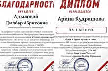 Поздравляем Кудряшову Арину, ученицу 7б класса и учителя русского языка и литературы Адылову Дильбар Абриковну с победой в Международном видеоконкурсе художественной декламации «Блок и Бунин: музыка и свет». Совместная работа привела к этой победе.