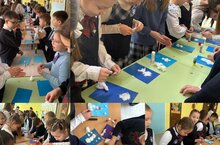 Для самых маленьких учеников 1-2 классов ребята подготовили пушистых снеговиков из ваты, а ребятам 3-4 классов показали, как складывать Деда Мороза в технике оригами.