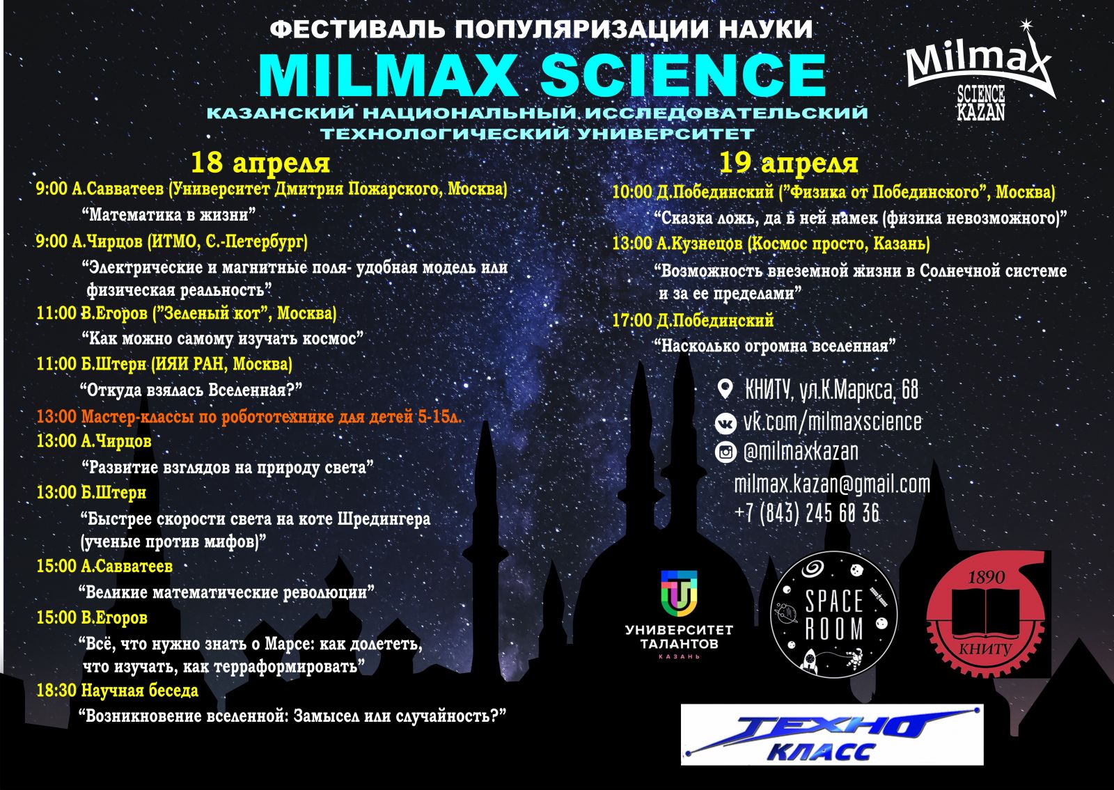 17-19 апреля 2019 года на базе КХТИ состоится Фестиваль популяризации науки. В программе Фестиваля - лекции и мастер-классы от выдающихся ученых нашей страны. Все лекции (кроме последней) бесплатны и рассчитаны на учащихся 6-11 классов. По ссылке вы можете подробно ознакомиться с программой Фестиваля. Программа фестиваля.jpg
