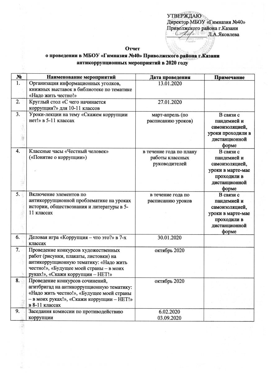 Отчет о выполнении плана мероприятий по антикоррупции за 2019 год МБОУ "Гимназия №40"