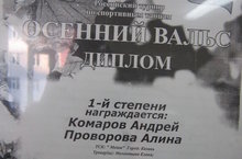 Поздравляем! Комарова Андрея и Проворову Алину – победителей Российского турнира по спортивным танцам «Осенний вальс» - и желаем им дальнейших спортивных и творческих успехов!
