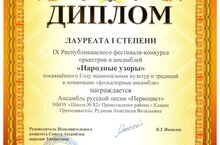 Поздравляем с победой школьный ансамбль "Первоцвет" , ставшие Лауреатами 1 степени в IX Республиканском фестивале-конкурсе оркестров и ансамблей "Народные узоры". 27.04.2023