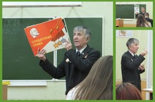 Ребятам о празднике рассказал самый почтенный, самый старший педагог нашей школы, Ветеран Великой Отечественной войны, полковник в отставке Низамов Ханиф Киямович, который с небольшой лекцией прошел по старшим классам.