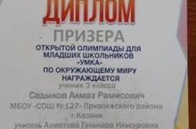 Поздравляем Садыкова Алмаза с Дипломом призера открытой олимпиады для младших школьников "Умка" по окружающему миру, руководитель Ахметова Г.И.