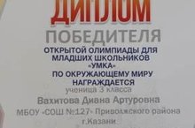 Поздравляем Вахитову Диану с Дипломом победителя открытой олимпиады для младших школьников "Умка" по окружающему миру, руководитель Ахметова Г.И.