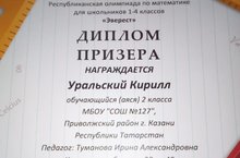 Поздравляем ученика 2 класса Уральского Кирила с диплом призера Респубдиканской олимпиады по математике "Эверест", руководитель Туманова И.А.
