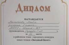 Поздравляем ученицу 5 класса Антонову Майю с Дипломом 3 степени в районном этапе городского конкурса "Звездный билет", руководитель Гараева Г.М.