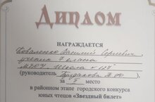 Поздравляем ученика 7 класса Коваленко Василия с Дипломом 2 степени в районном этапе городского конкурса "Звездный билет", руководитель Булдакова Т.Ю.