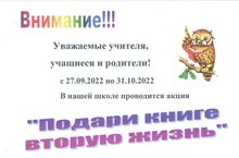 С 27.09.2022 по 31.10.2022 в школе проходит акция "Подари книге вторую жизнь!