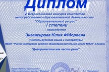 Учитель русского языка Зигангирова Ю. Ф. заняла первое место в VI Всероссийском конкурсе конспектов непосредственно-образовательной деятельности "Образовательный ресурс" образовательного центра "Магариф"