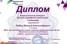 Ученики 8 А класса Рубец Леонид и Арестова Анастасия заняли первое место во Всероссийском конкурсе "Лучшее портфолио школьника". Педагог подготовивший победителей: Хуснуллина А.Р. Учитель был отмечен благодарственным письмом за подготовку победителей конкурса.
