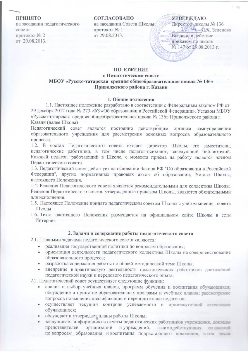 ПОЛОЖЕНИЕ о Педагогическом совете МБОУ «Русско-татарская средняя общеобразовательная школа № 136»