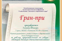 19 декабря 2020 года на базе МБОУ «Гимназия №6» г.Казани проводилась XIV Республиканская научно-практическая конференция обучающихся «Глобализация- реальность современного мира». Ее целью являлось создание условий для формирования интереса к познавательной, творческой, исследовательской, интеллектуальной деятельности обучающихся 3-11 классов. В работе данной конференции принял участие ученик 7В класса Галиев Тимур (научный руководитель учитель истории Блохина Л.Н.) Их работа «Батарея, огонь!», посвященная зенитчицам Татарстана была высоко оценена жюри конкурса и получила Гран-при.