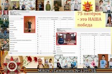 Продолжается акция «10 дней до Победы». Учащиеся гимназии проявляют упорство в достижении хорошей успеваемости, показывают прекрасное качество знаний и стараются своими достижениями показать, что не зря ценой нечеловеческий усилий нашими героями ВОВ были спасены следующие поколения. В честь 75-летия Победы 5Б класс под руководством Пузыревой Л.И. оформил табель успеваемости с 75 пятерками.