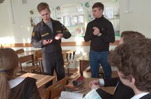Чакырылган кунаклар Харьковский Д.Е. (Санкт Петербургтагы Михайловская военная артиллерийская академиясе студенты) белән Лавренюк А.С. (Черноморское Высшее военно-морское училище им.П.С.Нахимова курсанты )укучыларга хәрби училищеларга керү кагыйдәләре турында сөйләделәр. Хәрби хезмәт юлын сайларга теләгән егетләр үзләрен кызыксындырган сорауларын бирә алды. Ватанны саклаучы һөнәре үтә җитди һәм җаваплы. -