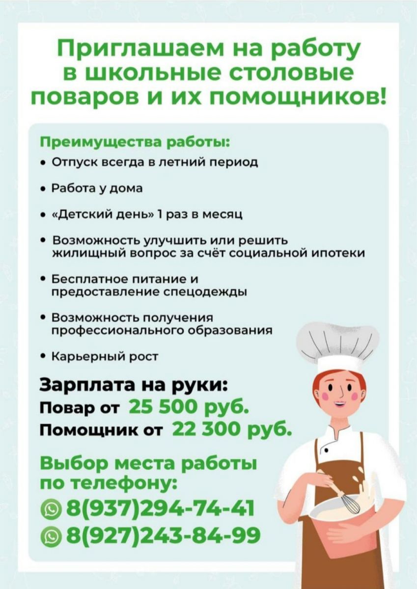 Приглашаем на работу в школьные столовые поваров и их помощников!