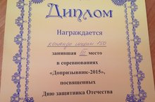 В рамках гражданско-патриотического месячника на территории нашей школы 20 февраля состоялся военно-спортивный праздник, посвященный Дню защитника Отечества. Праздник начался с товарищеской встречи по хоккею с шайбой между командами « АТП-1» и Гимназия №6». В конкурсах «Допризывник -2015» приняли участие команды школы№150, гимназии №16, гимназии№6 и команда ПК «БОКС». Ребята соревновались в перетягивании каната, в поднятии гири, фитнес – тесте, в стрельбе из пневматической винтовки и в меткости в игре дартс. В результате сильнейшей конкурентной борьбы призовые места распределились следующим образом : 1 место – команда ПК «БОКС», 2 место – команда гимназии№6, 3 место –команда нашей школы. Этот праздник формирует у старшеклассников интерес к регулярным занятиям спортом и приобщения к элементам Всероссийского физкультурно-спортивного комплекса ГТО.