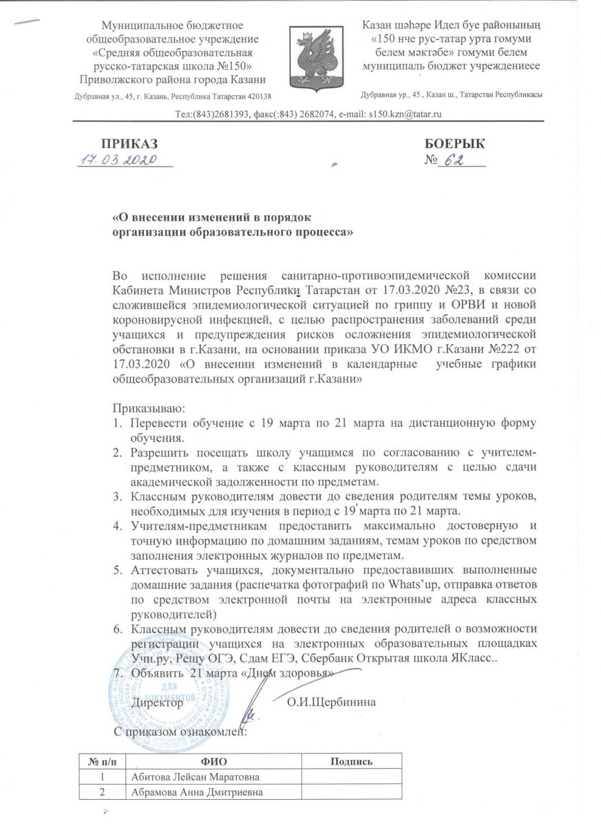 О внесении изменений в порядок организации образовательного процесса 17.03.2020