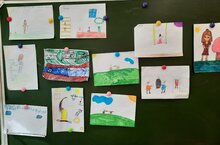 У ребят был урок английского языка, где ребята пели песни, а также познакомились с музыкальными инструментами, как они звучат, называются на английском, и как своими руками сделать гитару из подручных материалов. Играли в спортзале и на свежем воздухе. Играли в конструктор, рисовали, смотрели мультфильмы.