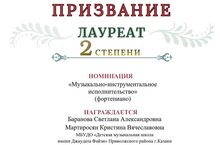 Преподаватели Светлана Александровна Баранова и Кристина Вячеславовна Мартиросян блестяще выступили на Всероссийском конкурсе профессионального исполнительского мастерства «Призвание». По итогам конкурса они были удостоены высокой награды — звания лауреата II степени. Успех Светланы Александровны и Кристины Вячеславовны является признанием их высокого уровня профессионализма, артистизма и преданности музыкальному искусству. Поздравляем наших талантливых педагогов с заслуженной победой!