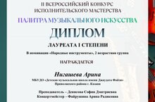 Поздравляем наших воспитанниц и педагогов с блестящим выступлением на Всероссийском конкурсе исполнительского мастерства «Палитра музыкального искусства»! Лауреаты I степени: Нигашева Арина Абдуллина Марьям Лауреат II степени: Ильичёва Кристина Победы подготовлены под руководством преподавателя Денисовой Софии Дмитриевны и при сопровождении концертмейстера Файрушиной Арины Радиковны. Высокие награды на престижном конкурсе - результат таланта, упорного труда учениц и высокого профессионализма педагогов. Мы гордимся вашими достижениями!
