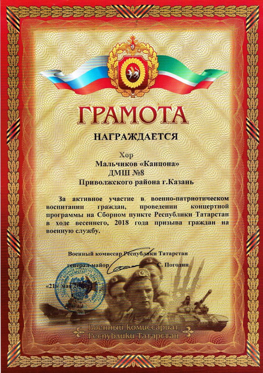 21 мая - проведение концертной программы - хор мальчиков "Канцона" - на Сборном пункте Республики Татарстан в ходе весеннего, 2018 года призыва граждан на военную службу. Руководитель: Мухаметзянова Диана Радиковна; концертмейстер: Баранова Светлана Александровна Грамота.