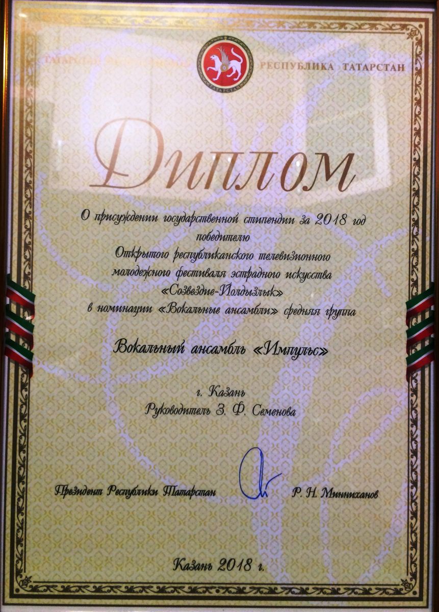 1 июня - присуждение государственной стипендии за 2018 год вокальному ансамблю "Импульс" - ПОБЕДИТЕЛЯМ Открытого Республикаснкого телевизионного молодежного фестиваля эстрадного искусства "Созвездие-Йолдызлык". Руководитель - Семенова Зитта Фаридовна. Диплом
