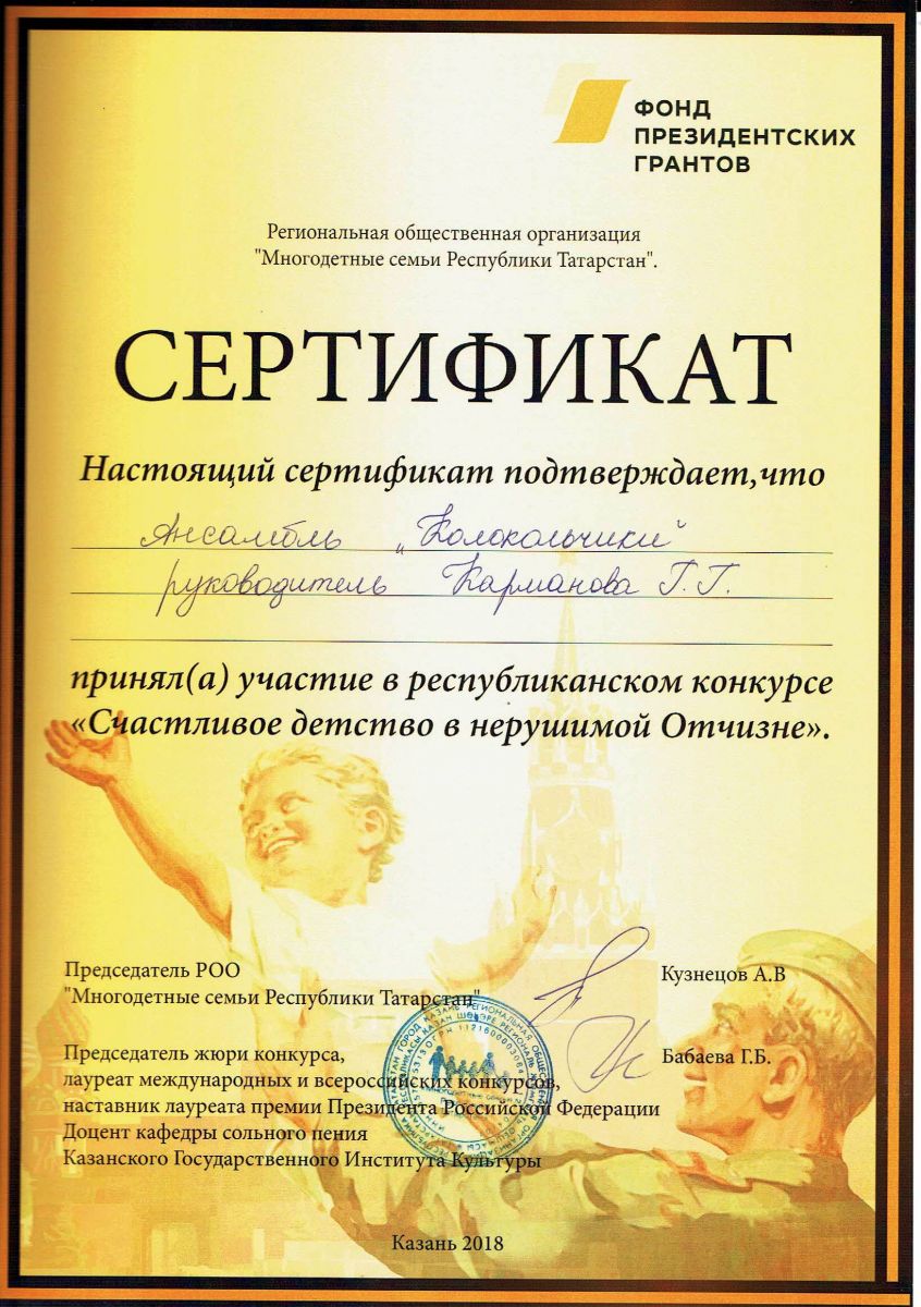 21 мая - выступление хора "Колокольчики" в Республиканском конкурсе "Счастливое детство в нерушимой отчизне"/Фонд президентских Грантов; руководитель: Карманова Г.Г. (Сертификат)