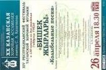 26 апреля - участие хора "Певуньи", вокальных ансамблей "Восьмушки", "Энҗеләр" в XIV республиканском фестивале татарской хоровой музыки "Бишек җырлары" ("Колыбельные песни"). /ГБКЗ имени С.Сайдашева/. Руководители: Семенова З.Ф., Заляева Л.М.; концертмейстер: Альметова Д.И.
