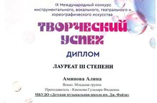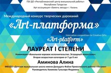 20 октября 2024 года прошел Международный конкурс творческих дарований "Art - платформа". Ученица Каюмовой Г.Ф. Аминова Алина была награждена дипломом лауреата I степени.