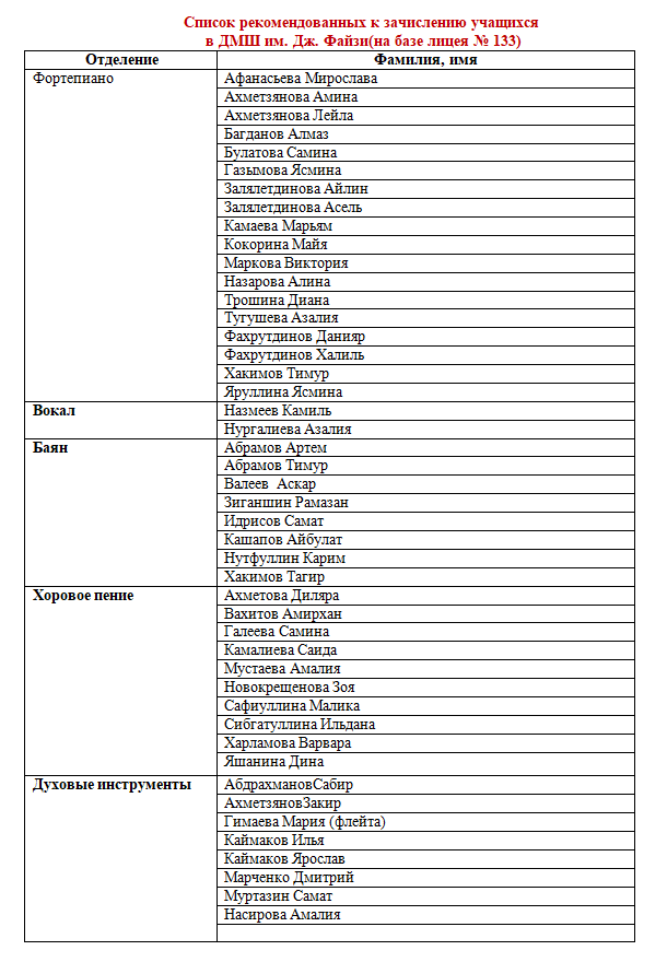 Список рекомендованных к зачислению учащихся в ДМШ им. Дж. Файзи(на базе лицея № 133)
