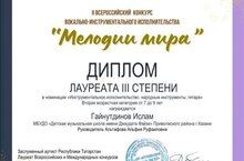 Учащийся нашей школы Ислам Гайнутдинов (класс преподавателя Альтафовой А.Р.) стал лауреатом III степени на II Всероссийском конкурсе вокально-инструментального исполнительства «Мелодии мира». От всей души поздравляем Ислама и Альфию Руфаиловну с блестящим результатом и желаем новых творческих побед!