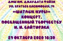 29.10.2020 г. в 18.30 на базе ДМШ им. Дж. Файзи состоится КОНЦЕРТ, посвящённый творчеству И.И.Байтиряка. Мероприятие пройдет без зрителей из-за особого санитарно-эпидемиологического режима, фото и видео-записи будут размещены по окончании концерта. ФОТО(см.); ВИДЕО ⇒ https://yadi.sk/d/qKYPLo2gQ8LBqA?w=1