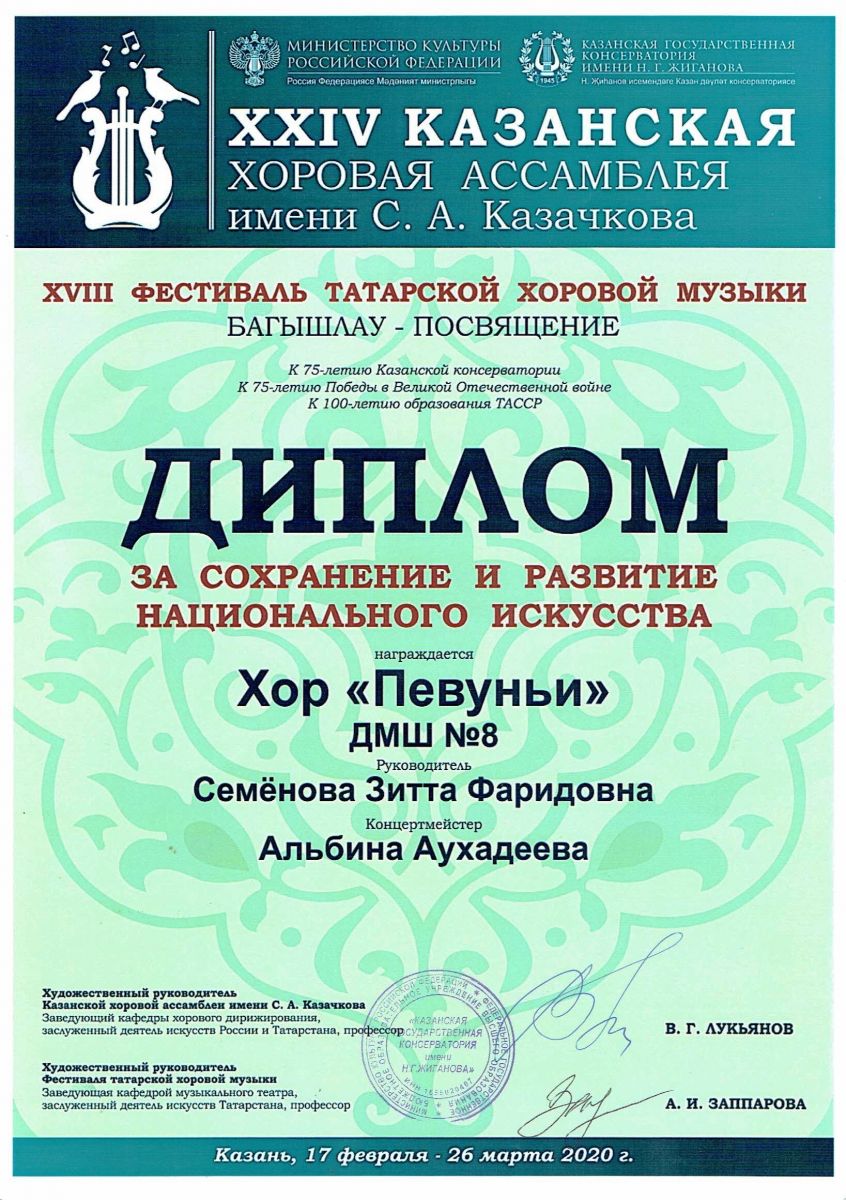 17 февраля - выступление хоровых коллективов "Певуньи", руководитель: Семенова З.Ф.; "Радуга", руководитель: Каюмова Г.Ф. в концерте "Син хәтерлә!" ("Ты помни!") в рамках XVIII фестиваля татарской хоровой музыки БАГЫШЛАУ - ПОСВЯЩЕНИЕ - к 75-летию Казанской консерватории, к 75-летию Победы в Великой Отечественной войне/ XXIV Казанская хоровая ассамблея имени С.А.Казачкова. (ГБКЗ им. С.Сайдашева) Диплом - хор "Певуньи"; Диплом - хор "Радуга". ФОТО