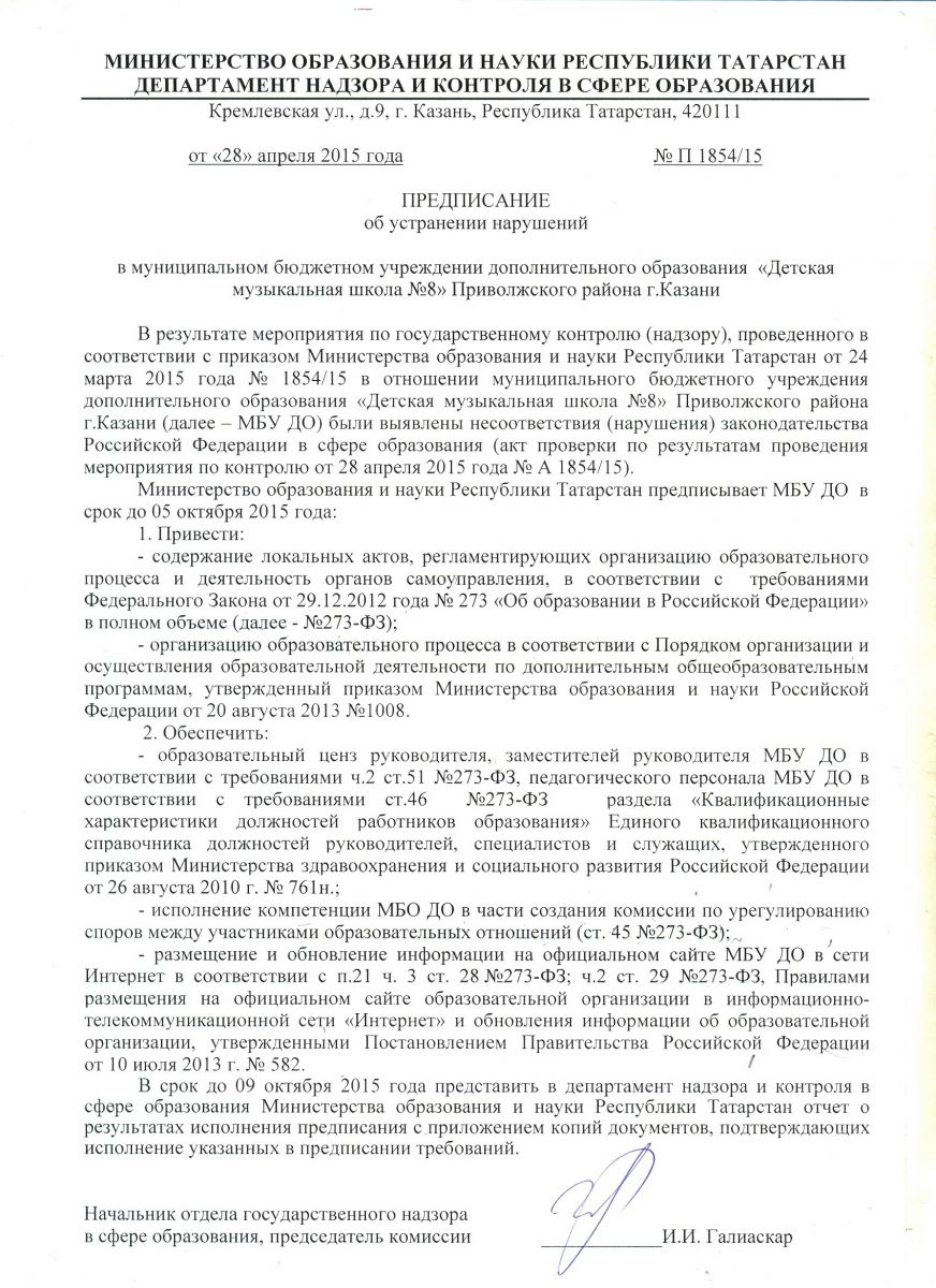 Предписание № П 1854/15 от 28.04.2015 г.