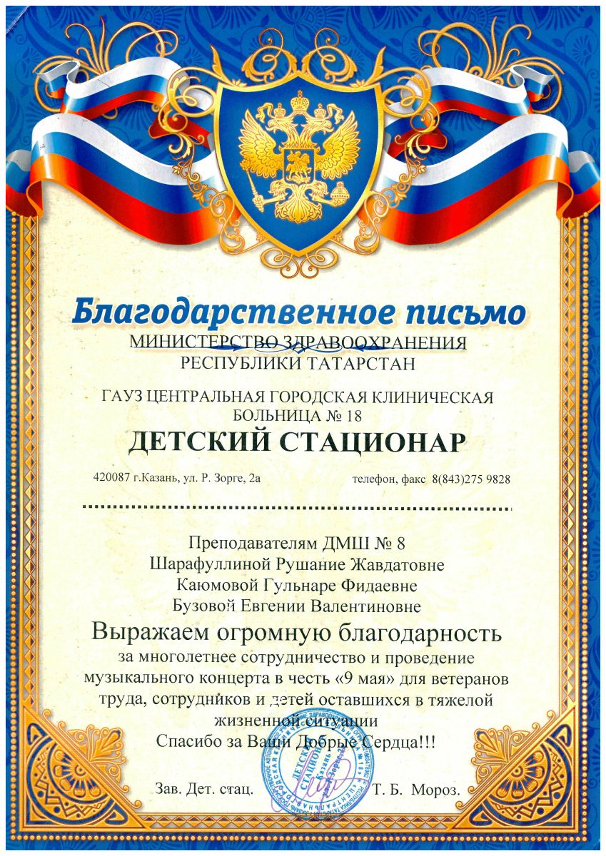 Выступление в детском стационаре ГАУЗ ЦГБ № 18 (Благодарственное письмо)