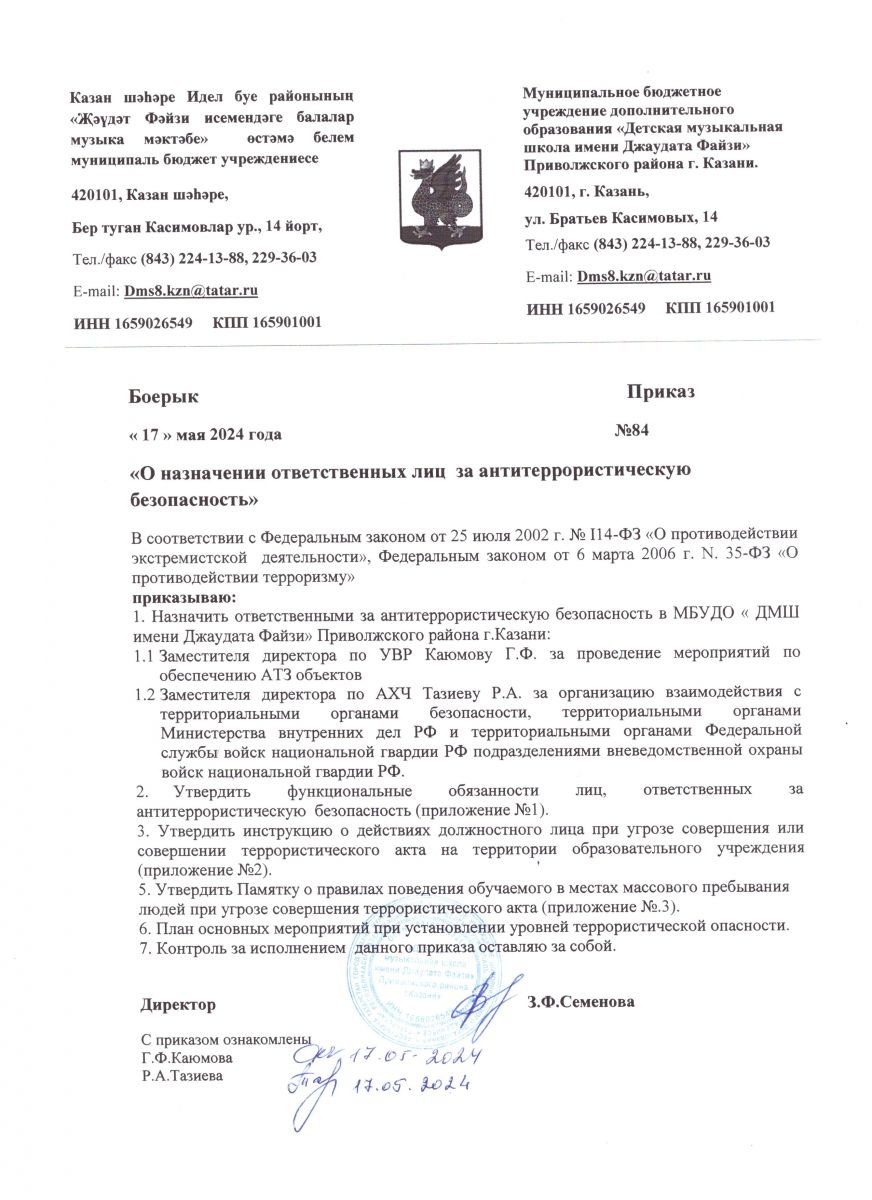 Приказ о назначении ответственных за антитеррористическую безопасность от 17.05.2024