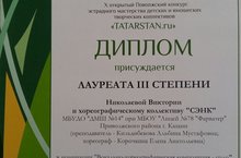Наши участники Николаева Виктория, Сунгатуллина Рената и хореографический коллектив "Сэнк" - Лауреаты III степени. Преподаватель - Кильдибекова Альбина Мустафовна. Хореограф - Корочкина Елена Анатольевна.