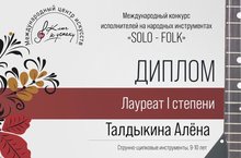 Победитель в Международном конкурсе исполнителей на народных инструментах "SOLO-FOLK" - ученица ДМШ20 класс домры преподавателя Ананичевой Наталии Алексеевны, концертмейстер Злобин Андрей Юрьевич! Отличные результаты!