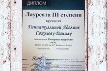 Преподаватель ДМШ № 20, студент выпускник КГК им. Н.Г.Жиганова Данил Юрьевич Соколов в дуэте с коллегой и сокурсником Гиниятуллиной Аделиной - Лауреат III степени Всероссийского конкурса пианистов им. М.В.Андрианова в г. Асбест Свердловской области в номинации "Камерный Ансамбль"