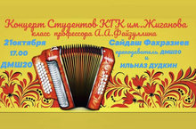 21 октября в 17.00 в ДМШ № 20 состоится Концерт преподавателя по классу баяна, духовых инструментов, аспиранта КГК им. Н.Г.Жиганова, класс профессора А.А.Файзуллина - Фахразиева Сайдаша Талгатовича и Льназа Дудкина - аспиранта КГК им. Н.Г.Жиганова